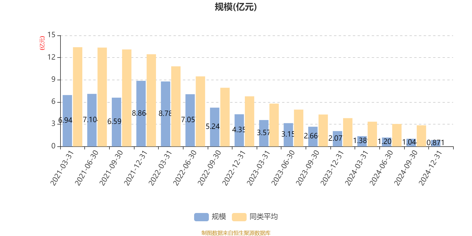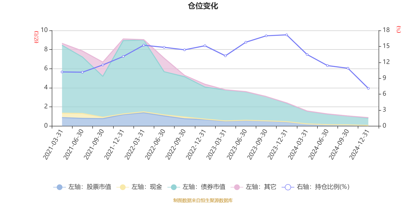 据定期报告数据统计,近三年平均股票仓位为13.79%,同类平均为18.78%。2023年末基金达到17.17%的最高仓位,2024年末最低,为7.09%。